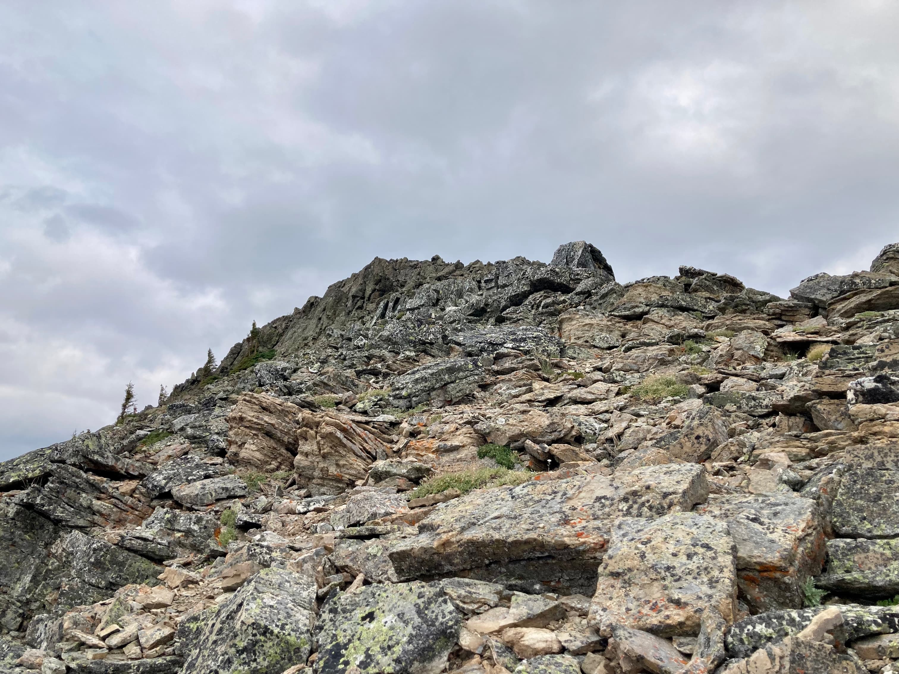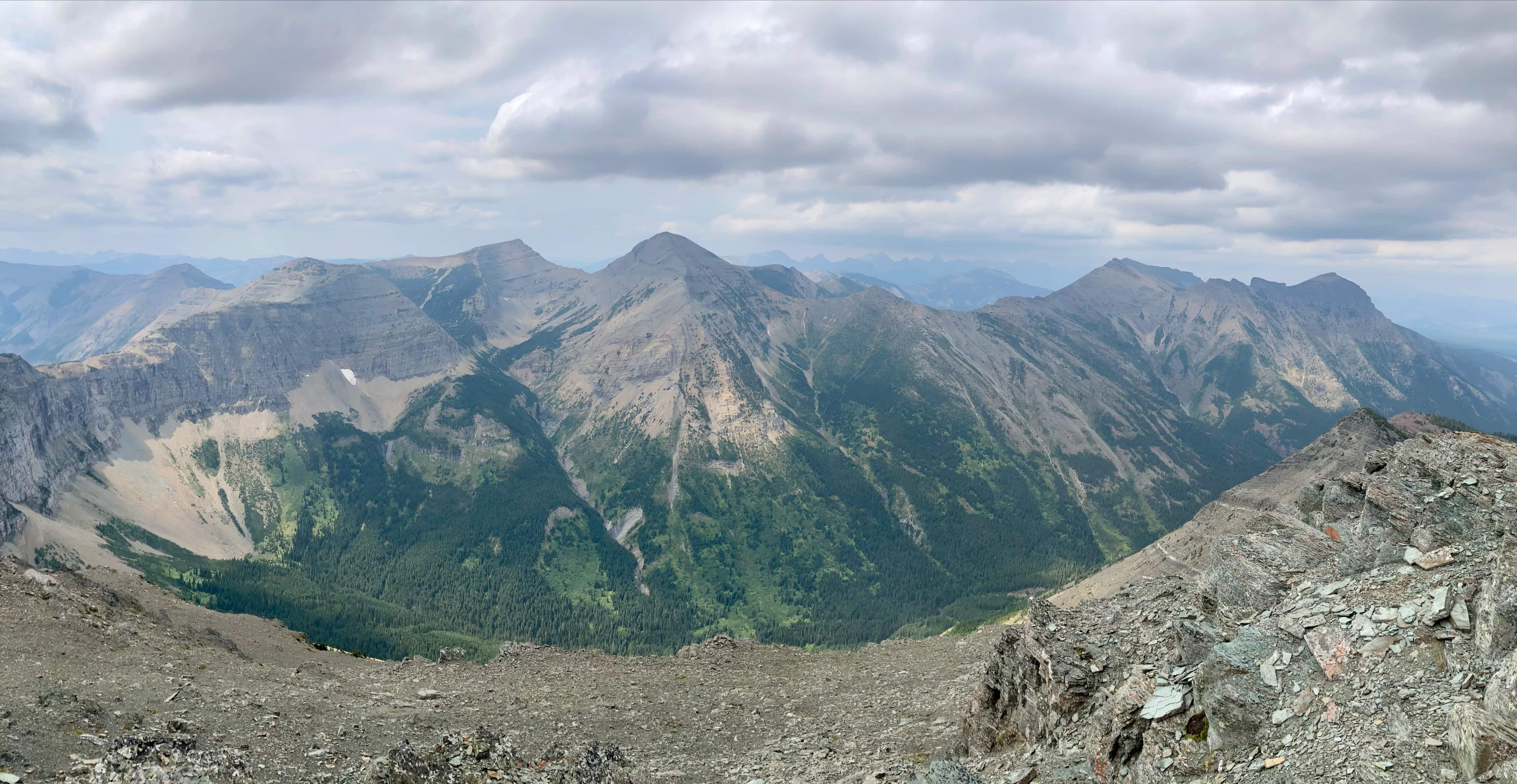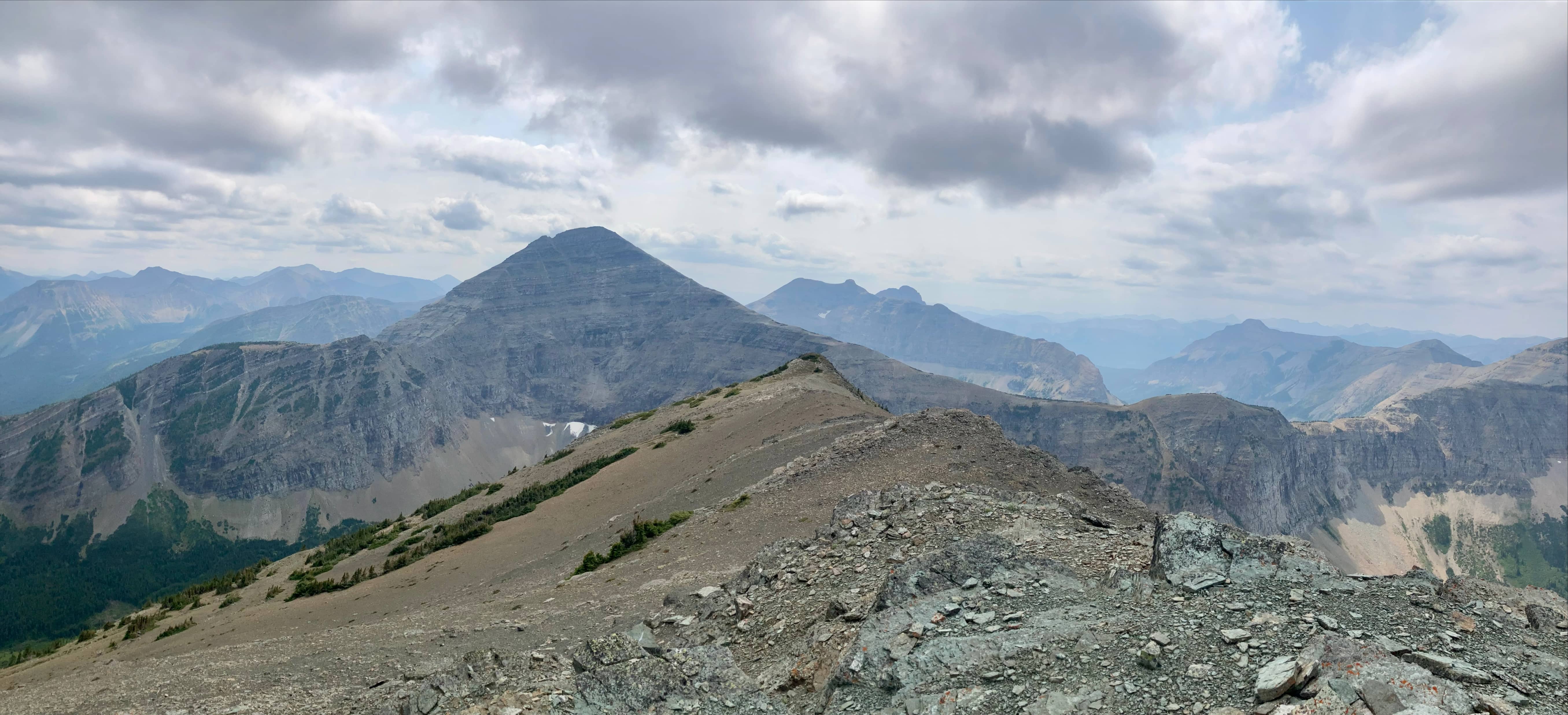 My approach and ascent of Mount Haig followed the route recorded in my prior post. I didn’t take many new pictures since the views were much more clear that day in 2019. 2023’s historic wildfire season continued to produce smokey, hazy skies. I was pleased to see that at some point between last summer (when I traversed Mount Haig on the way to Tombstone Mountain) and this summer someone has put up flagging to guide people on the correct trail through the underbrush after leaving the Paradise Lake trail and heading up to the ascent ridge of Mount Haig.