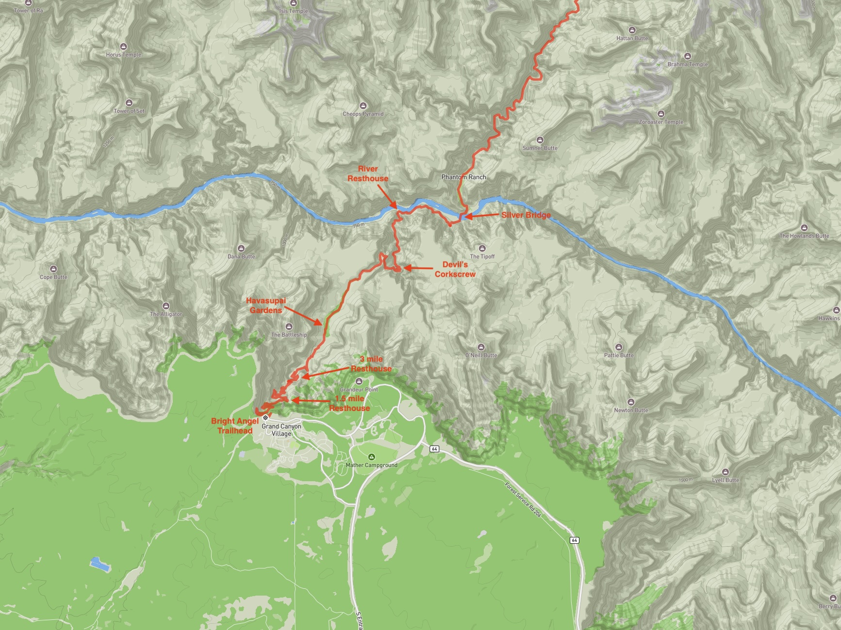 The signs are good advice, but a substantial number of strong hikers make a point of doing exactly what they advise against – either hiking from a trailhead to the Colorado River and back in one day (“rim-to-river”) or hiking from one rim across the canyon to the opposite side in one day (“rim-to-rim” or R2R). There are also quite a lot of people who trail run back and forth across the canyon twice in a single day (“rim-to-rim-to-rim” or R3). A few months ago I got invited along on a trip Arizona and Utah to do some hiking. The primary objective of the trip was a Grand Canyon rim-to-rim hike. The plan was to start at the North Rim. We would descend from the North Kaibab trailhead and journey along the bottom of the canyon to Phantom Ranch and Bright Angel Campground. Then we’d cross the Colorado River and ascend along Bright Angel Trail to the South Rim.