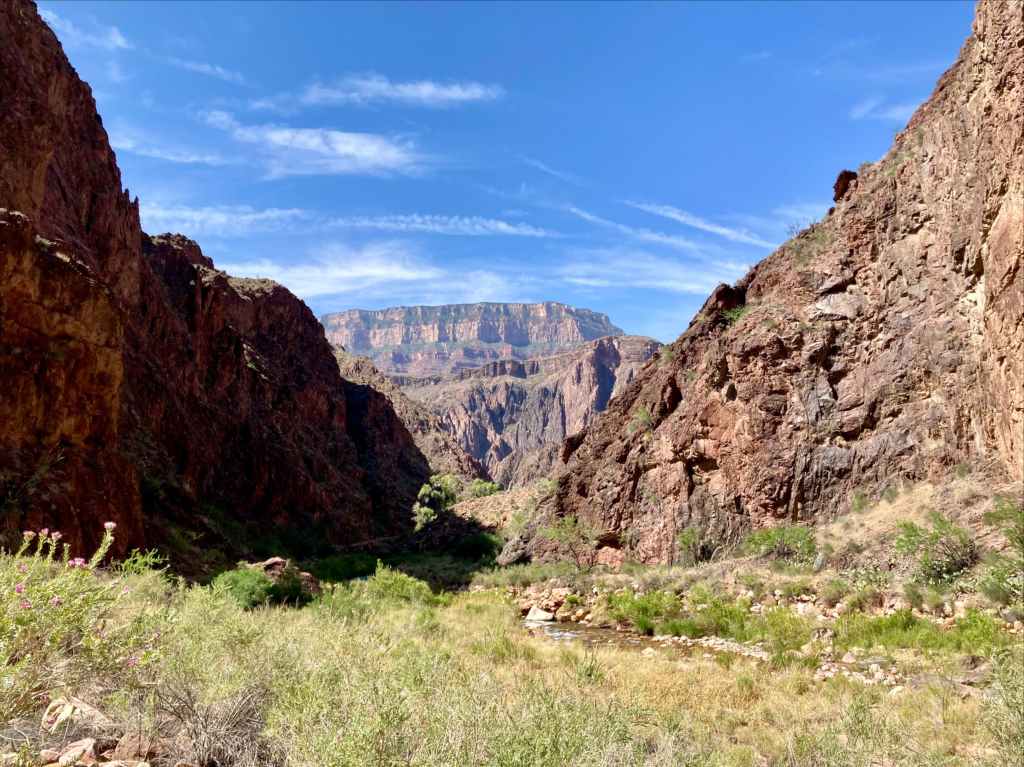 We didn’t detour to Ribbon Falls since we felt the need to cover as much distance as possible before the heat of the day set in. The next landmark we were looking for is referred to as The Box – an area where the canyon walls are close together and temperatures can rise far higher than in the surrounding canyon. It is also where Phantom Creek joins Bright Angel Creek from the west, flowing from Phantom Canyon. Incidentally, if one were to follow Phantom Canyon upstream they’d encounter Haunted Canyon. I haven’t been able to find a specific reason for this spooky set of names. We reached The Box well before the onset of the daytime heat and enjoyed the fascinating ambience of that section of trail before finally reaching Phantom Ranch and Bright Angel Campground. This was 22.7 km from the North Kaibab trailhead, and the end of our 1750 m descent.