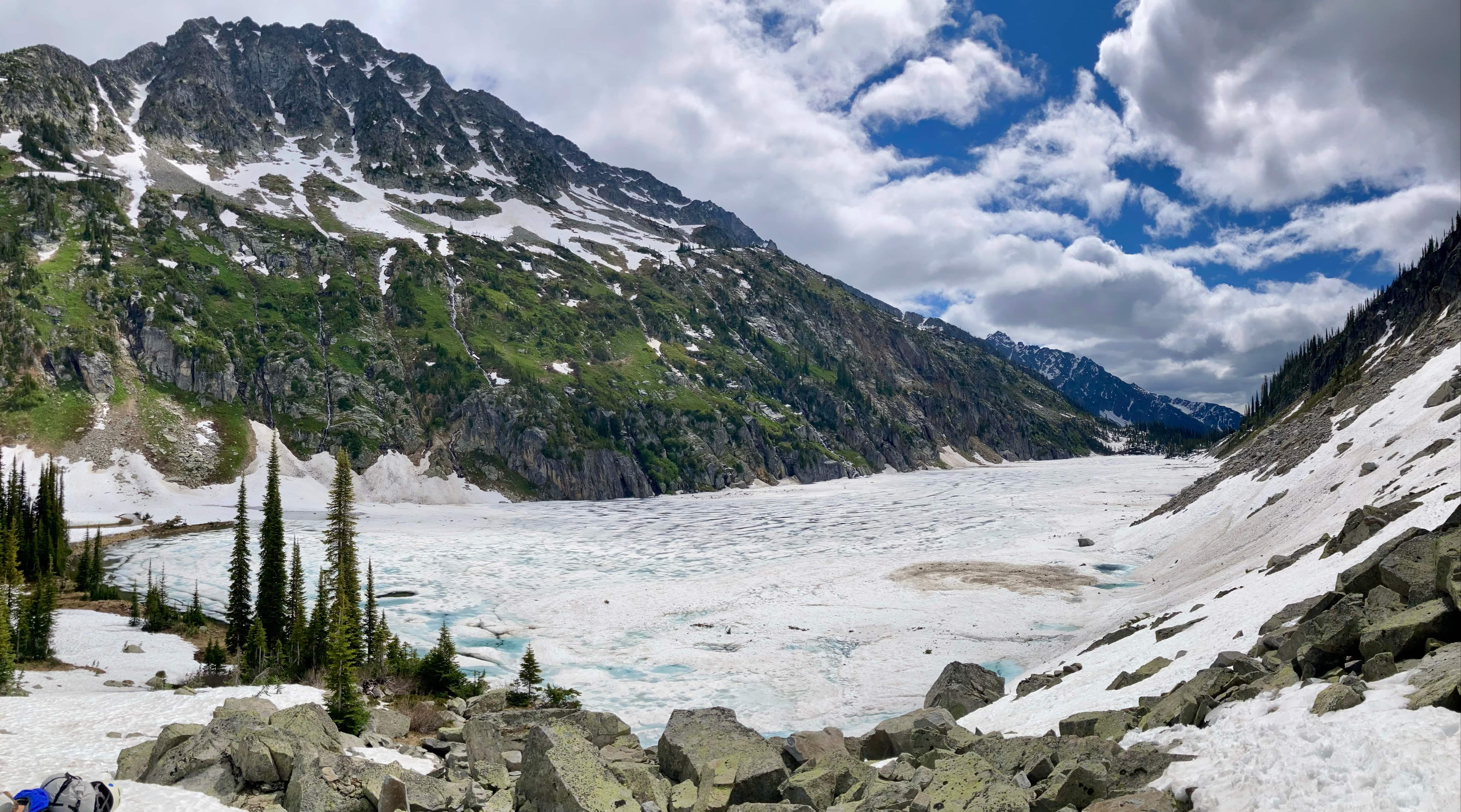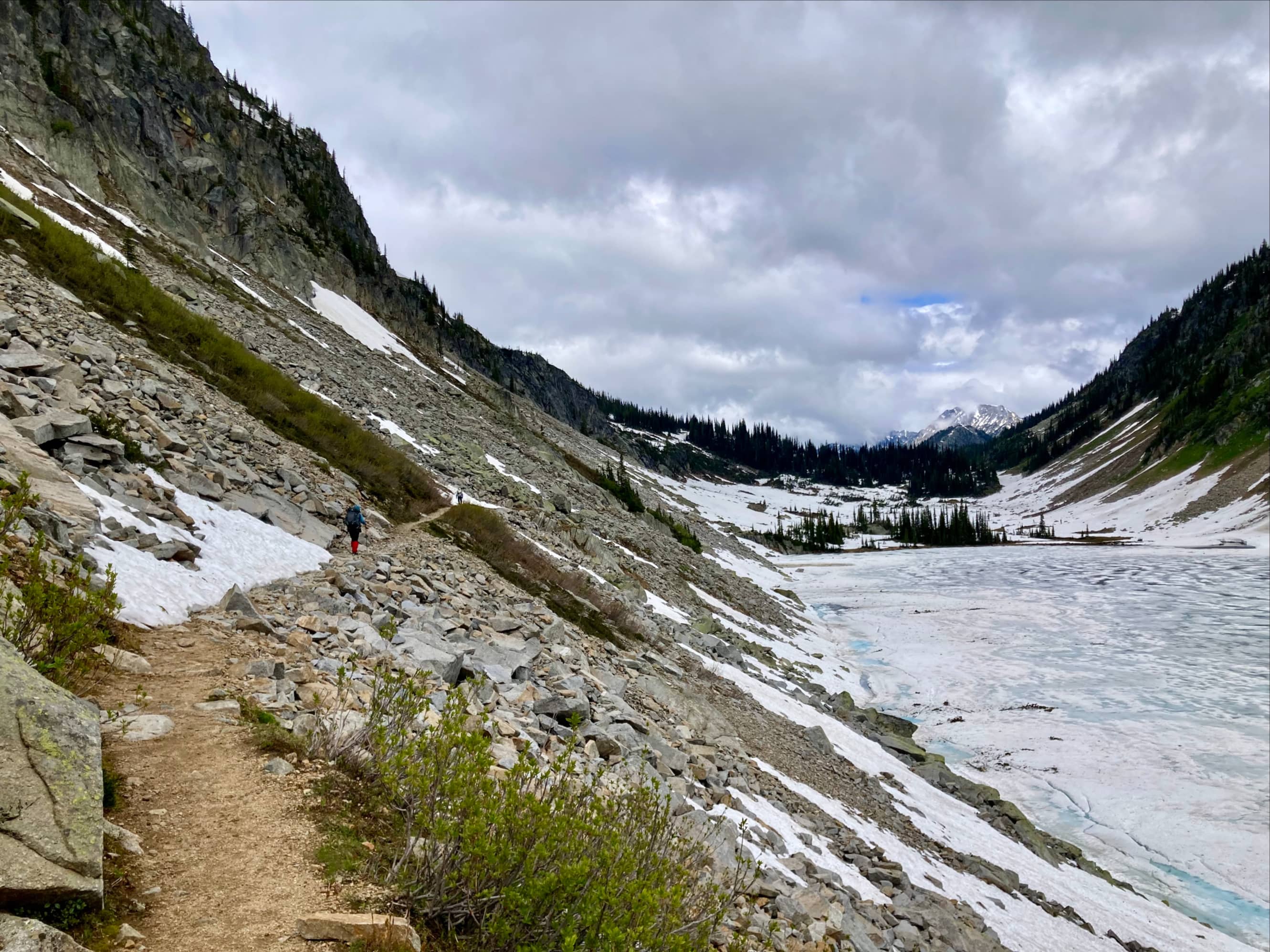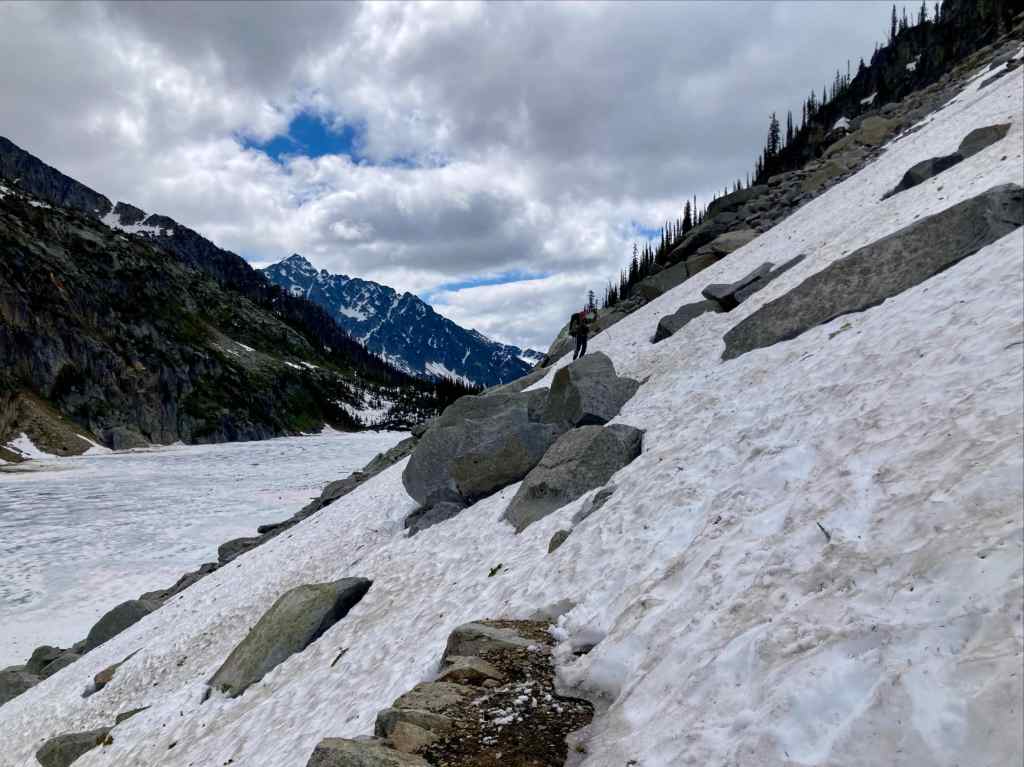 Once we reached Kokanee Lake we could see the line of the trail as it traversed above the lake on the western wall of the valley. A few weeks earlier there was still a lot of snow reported on and above the route, but when we arrived it looked mostly clear. We picked up the trail behind the pit toilets at the southern end of the lake. The most significant snow patch to cross came at the northern end of the traverse where we encountered a large party hiking out. We waited for them to pass by before finishing our traverse and entering the snow-filled valley north of the lake.