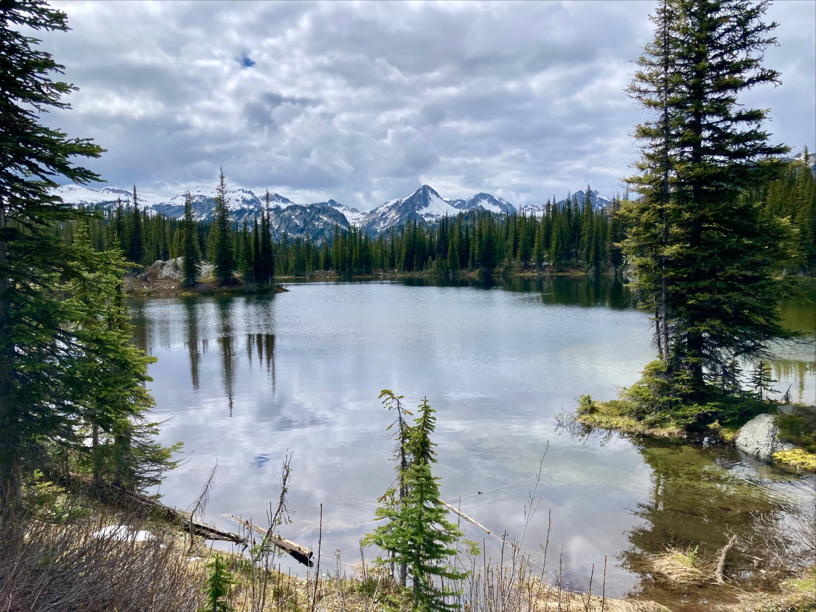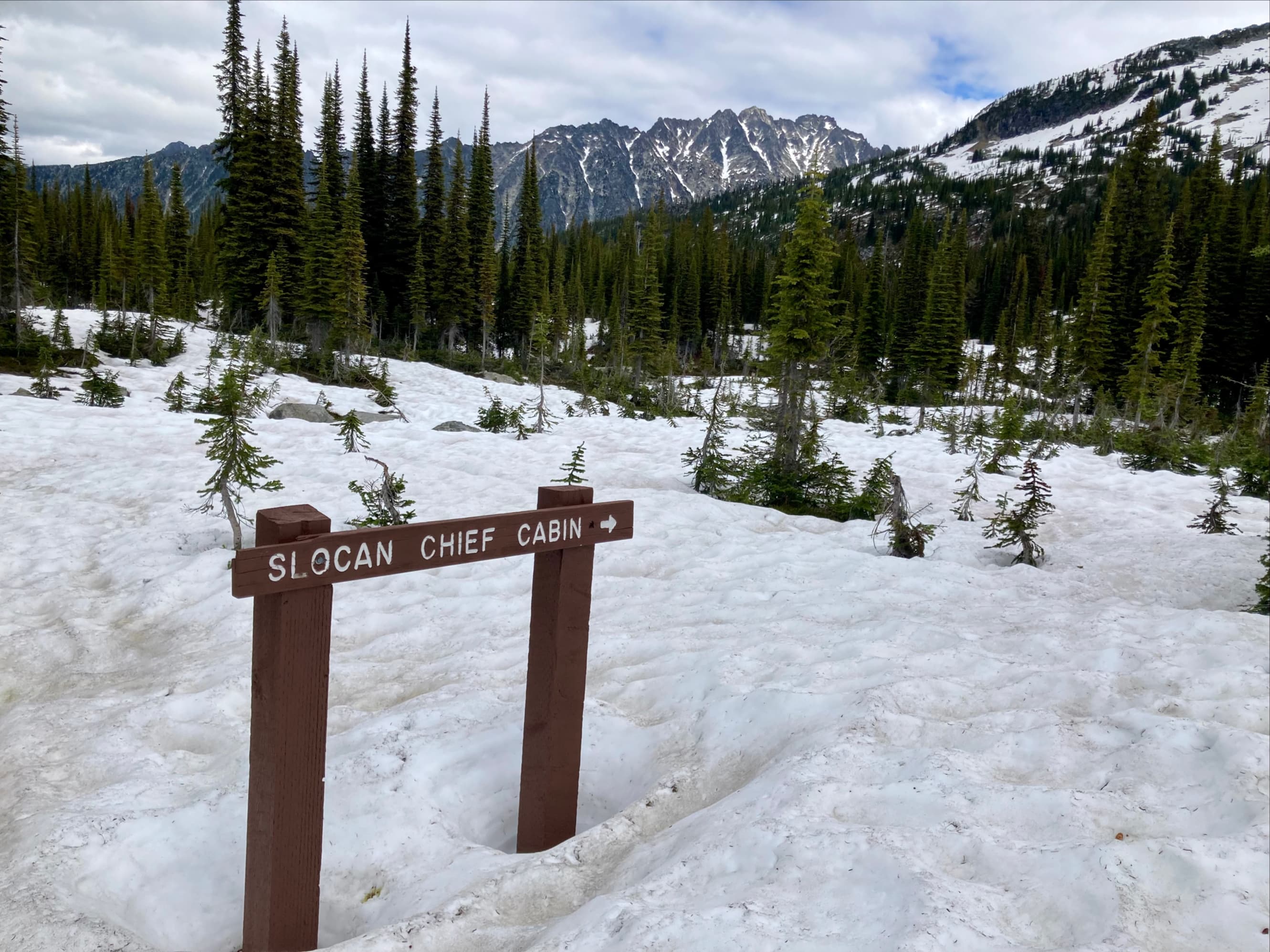 The Kokanee Lake Trail ascends in two long switchbacks to the east of Gibson Lake. We passed several cascades that tumbled down alongside the trail, flowing quite brisk with the ongoing snow melt. Once we’d climbed a short while we got a nice view back towards Gibson Lake. Lines of sight also opened up towards the surrounding peaks. The trail didn’t have any significant snow on it until we got to the “Kokanee Lk 1.2 km” sign post. It wasn’t too hard to find our way as we entered the snowy area, though from time-to-time we had to search a bit to discover where the trail re-emerged from under sections of deep snow. As we neared Kokanee Lake the snow cover got more consistent.