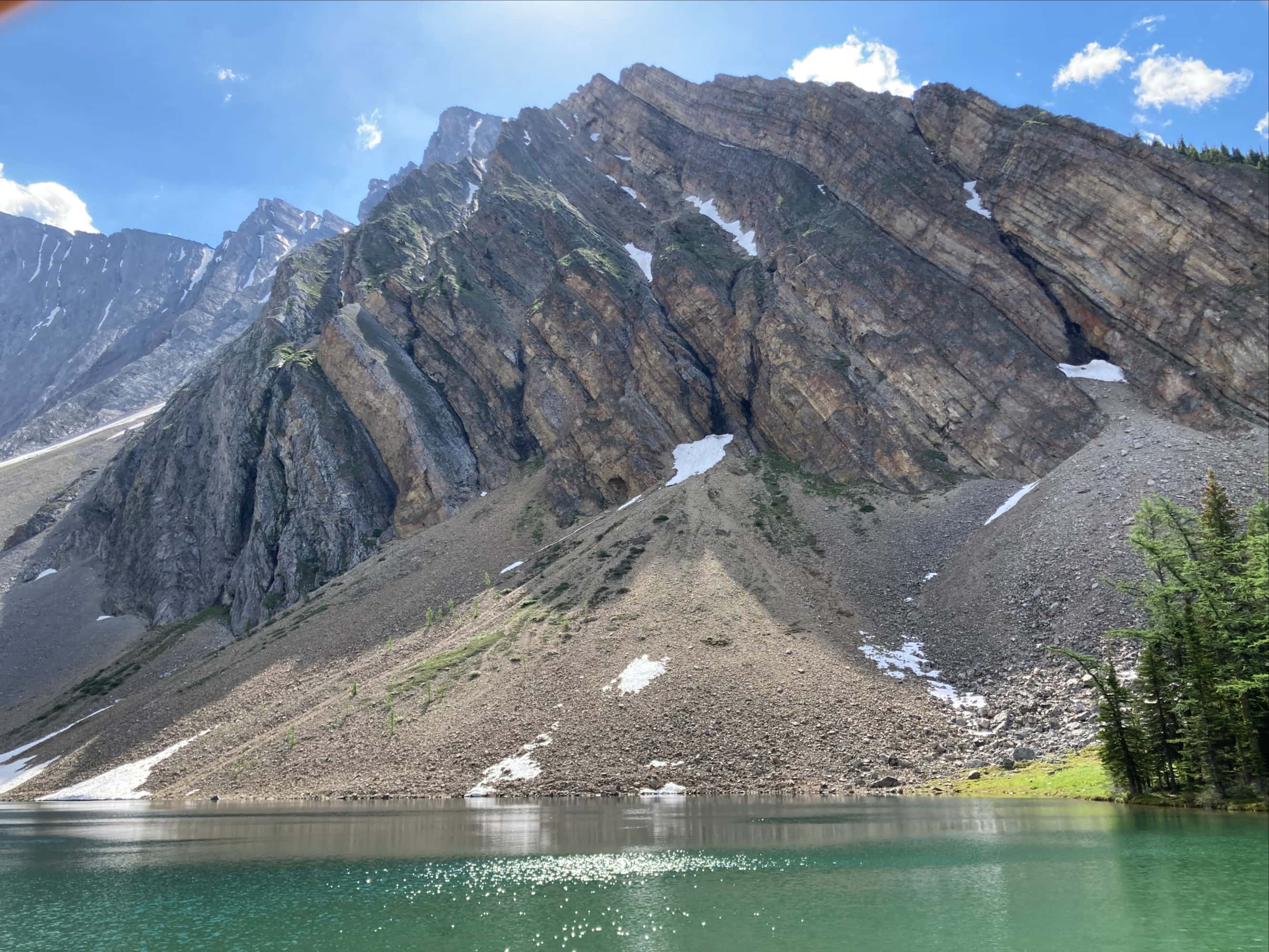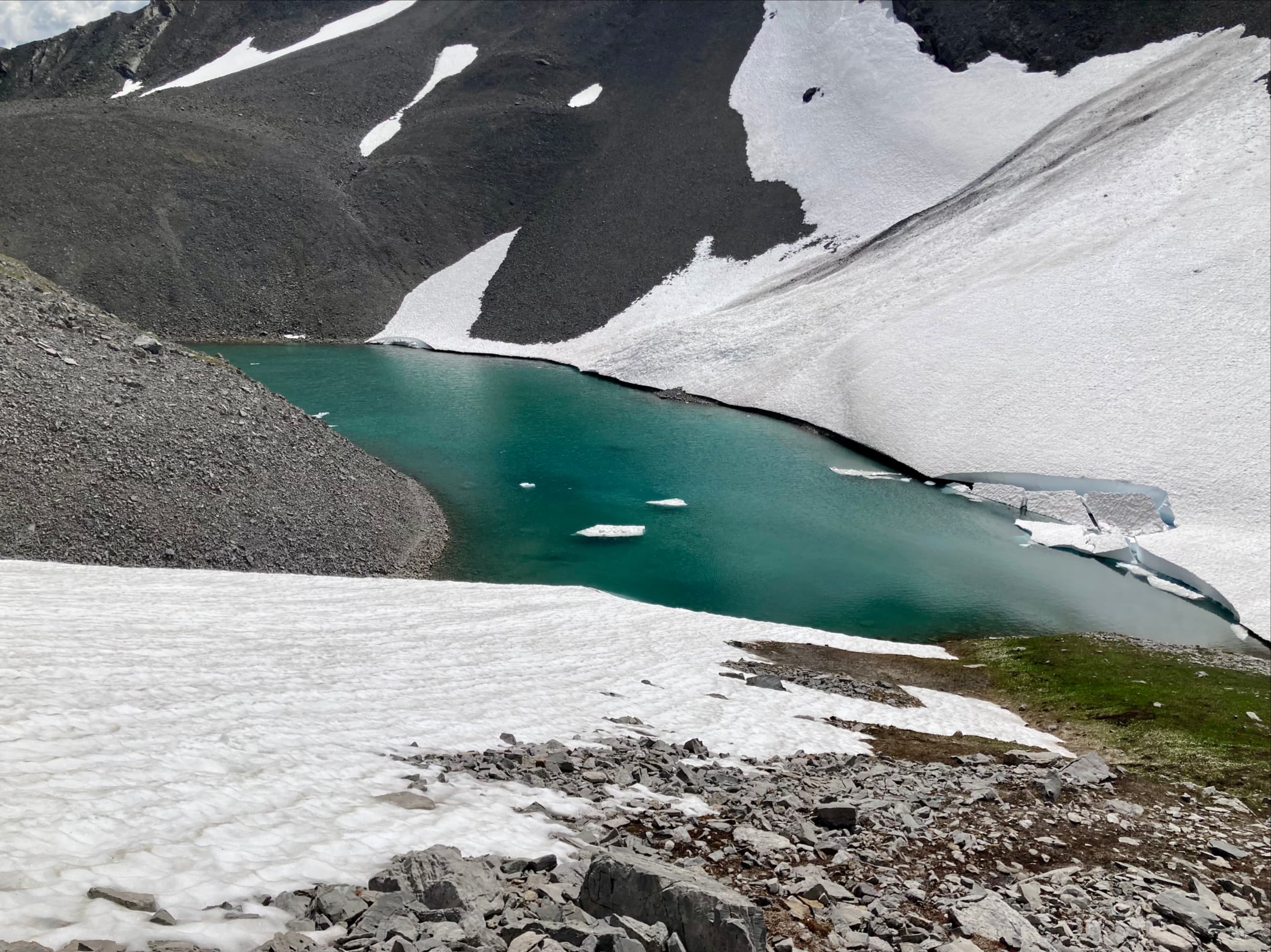 The trail took us to this snow patch, which proved to be our end point. It was fairly steep, the footing wasn’t great, and the run-out was straight into the water. Not ideal for our group. A trail is visible right alongside the water in this picture, but the route to the pass stays higher. The pass was just a few hundred meters beyond here.