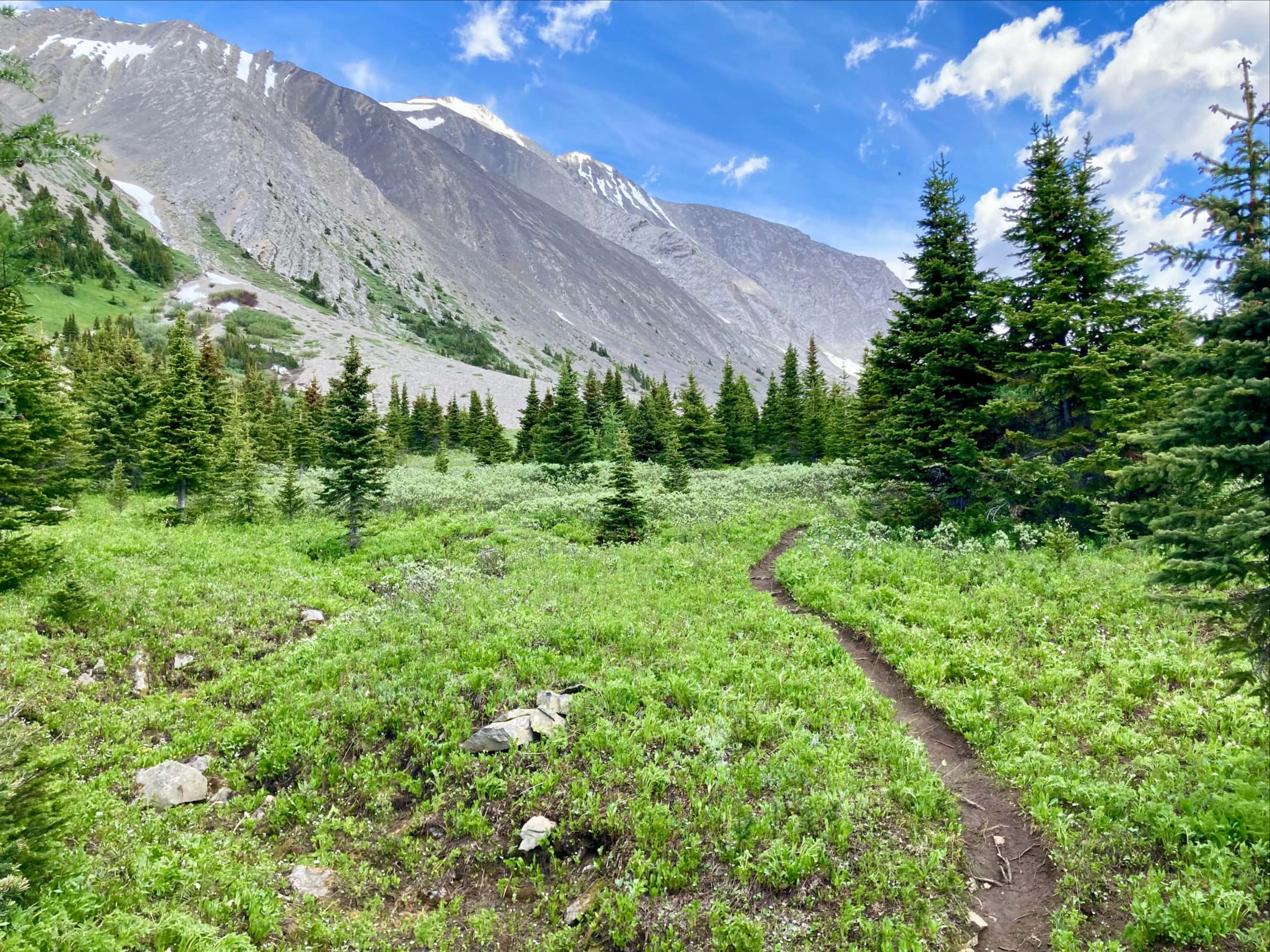 The shores of Rummel Lake were pretty buggy, but that didn’t detract much from the overall experience. Once we had a snack and a chance to take in the views we set out toward Rummel Pass. We followed the lakeside path clockwise for a short distance until a very obvious (though unsigned/unmarked) path set out north from the lake. Though easy to follow, this path was more narrow and rough than the path to the lake. After pushing through areas crowded with trees and up one steep climb we broke out into a high alpine meadow and took in the views ahead of us towards the pass and behind us across the valley.