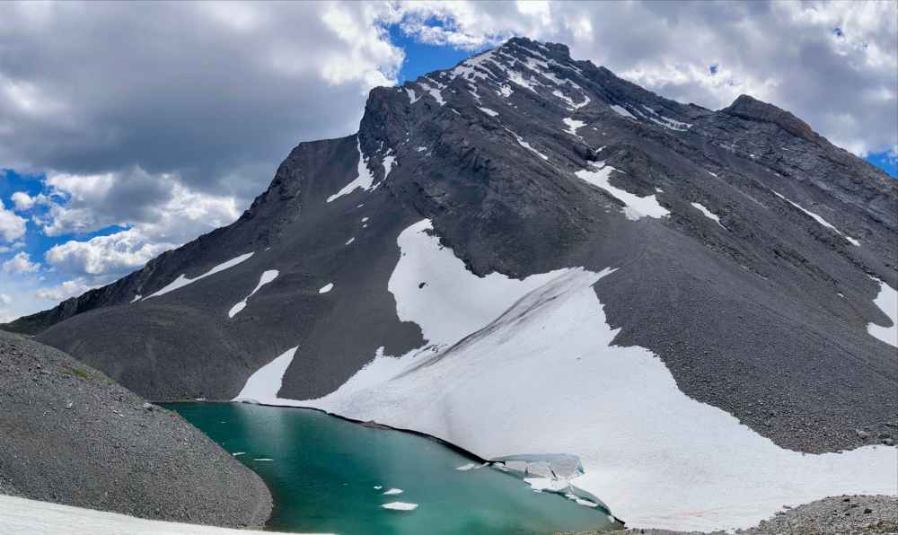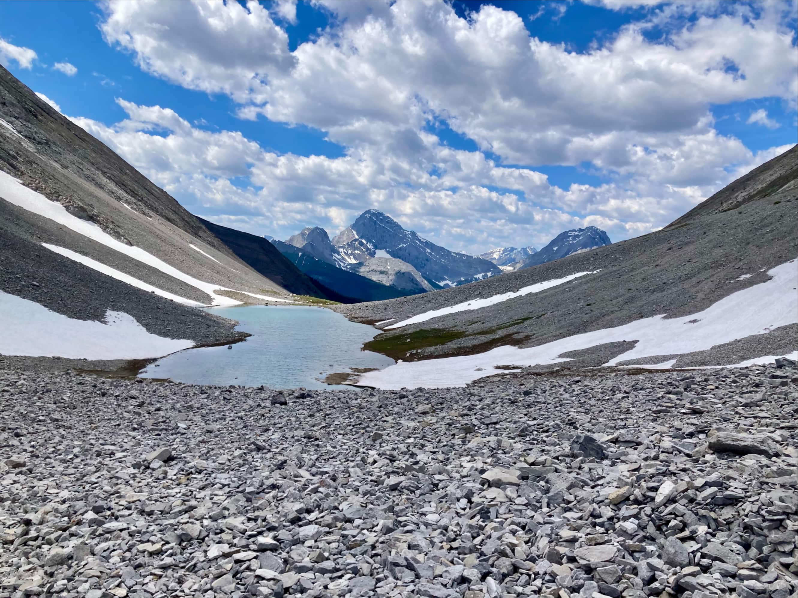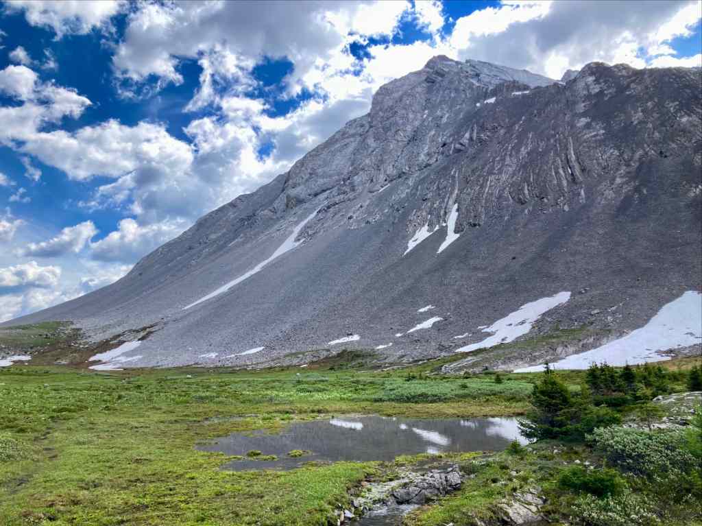 A short distance north of the perpetually busy Chester Lake trail in Kananaskis is the Rummel Lake trail. It is featured in both Gillean Dafferin’s Kananaskis Country Trail Guide Vol 1 as well as the Copelands’ Where the Locals Hike in the Canadian Rockies. Both describe Rummel Lake as being Chester Lake’s equal in beauty, but more tranquil because of the smaller number of hikers that seek it out. It also serves as a stepping stone to Rummel Pass, between Mount Galatea and The Tower. Our plan was to get up to the lake, see how everyone was feeling, then strike out beyond the lake to Rummel Pass. We made it within a few hundred meters of the pass before being turned back by an unfriendly snow patch, but the trip beyond the lake was totally worthwhile and took us to two tarns and a beautiful high mountain meadow.