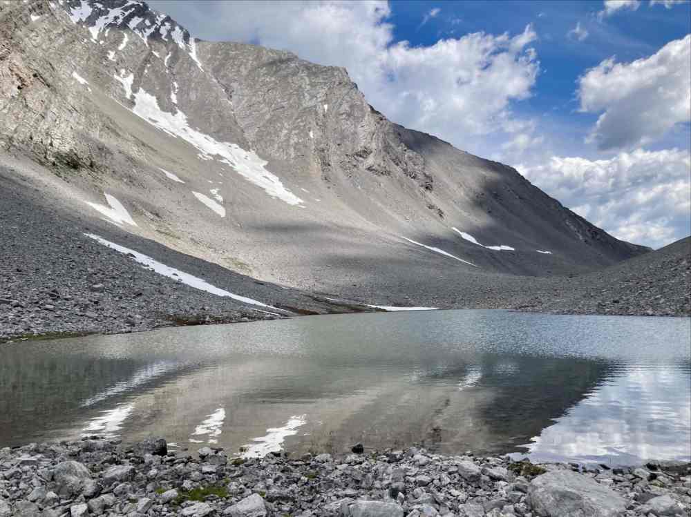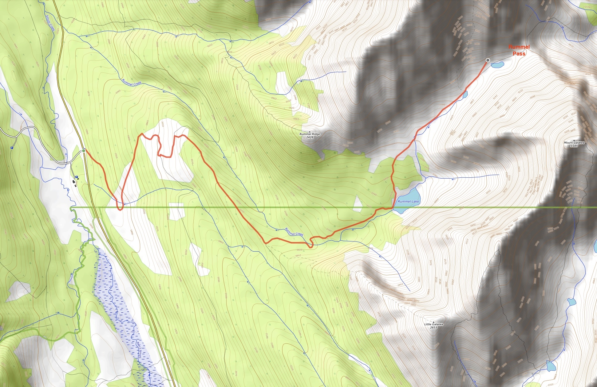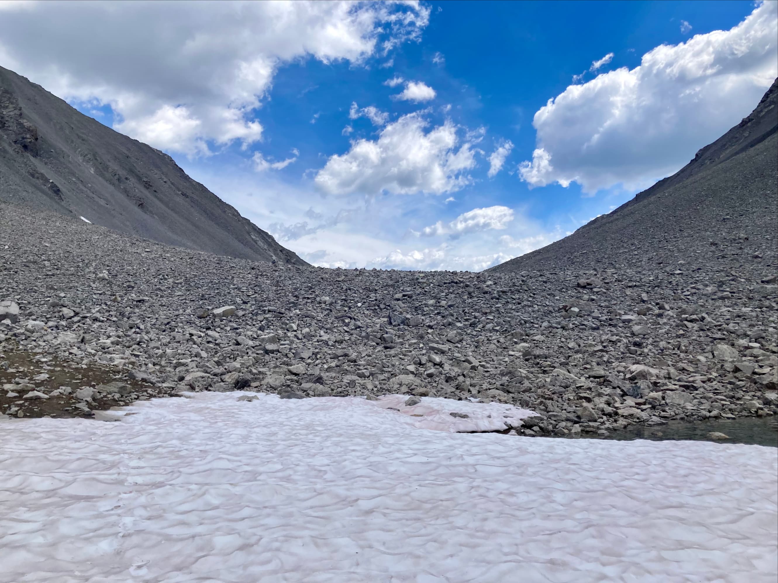 After our break we pushed on and reached the 2nd tarn, a few hundred meters short of the top of the pass. Unfortunately, here we encountered a large snow patch that was fairly steeply inclined with a runout directly into the waters of the tarn. We all agreed to make this the end of our trip. While we didn’t make it to the top of the pass, we still were treated to great views and engaging hiking. Extending the trip beyond Rummel Lake was definitely worthwhile.