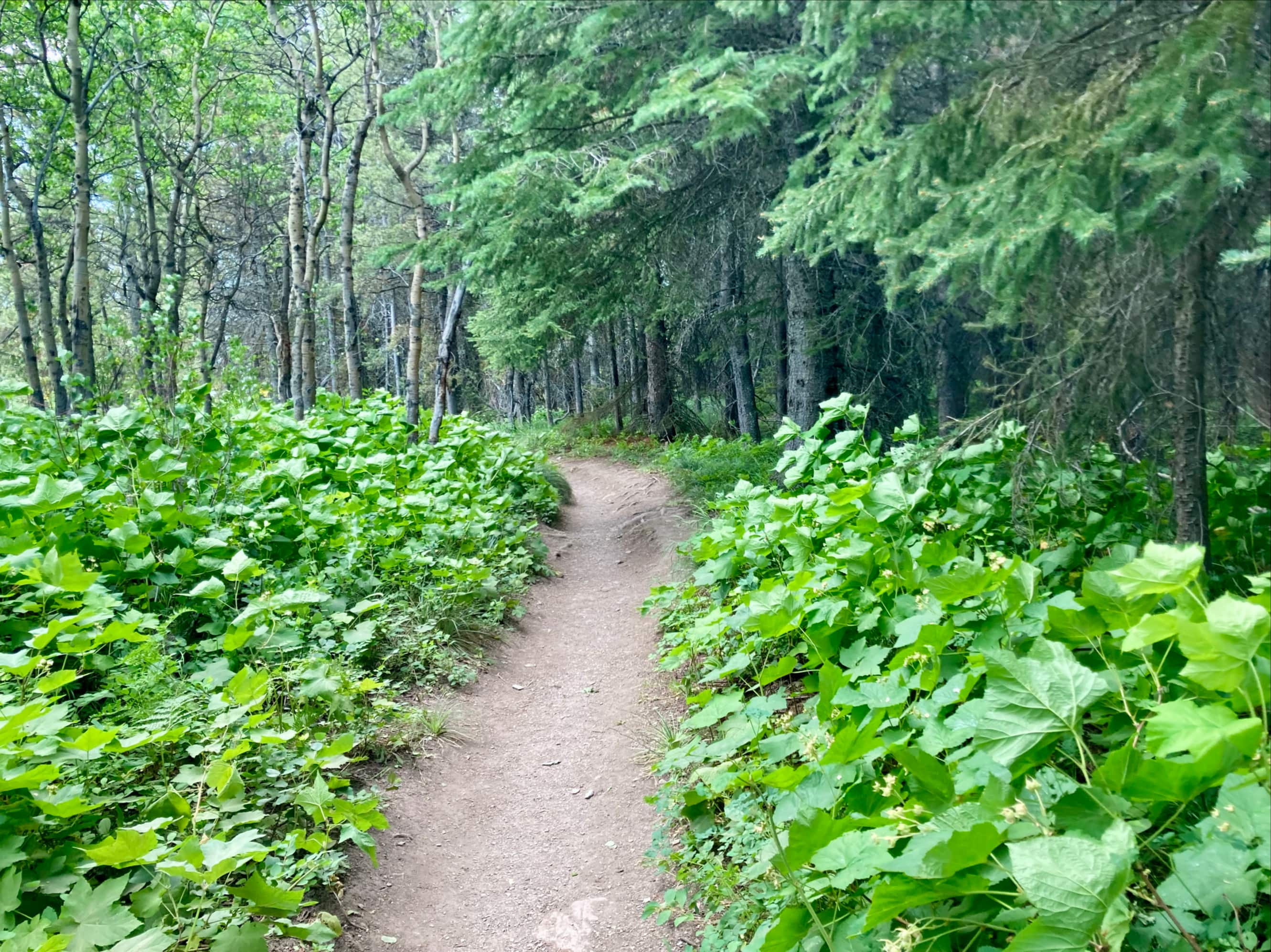 The trail starts behind the Swift Current Motor Inn, at the end of the Many Glacier Road. A sign next to the large Motor Inn parking area directed us to the trailhead. Setting off on the trail we soon encountered a signed intersection and turned left (northwest). We should have paid a bit more attention here – we walked right by the sign on the way down and ended up having to backtrack on a loop trail (omitted from my topo map route above). In our defence, the sign points to a ‘campground’ and we didn’t really think we were on our way back to a campground. However, right next to the big parking lot we left the car in is the Many Glacier Campground.