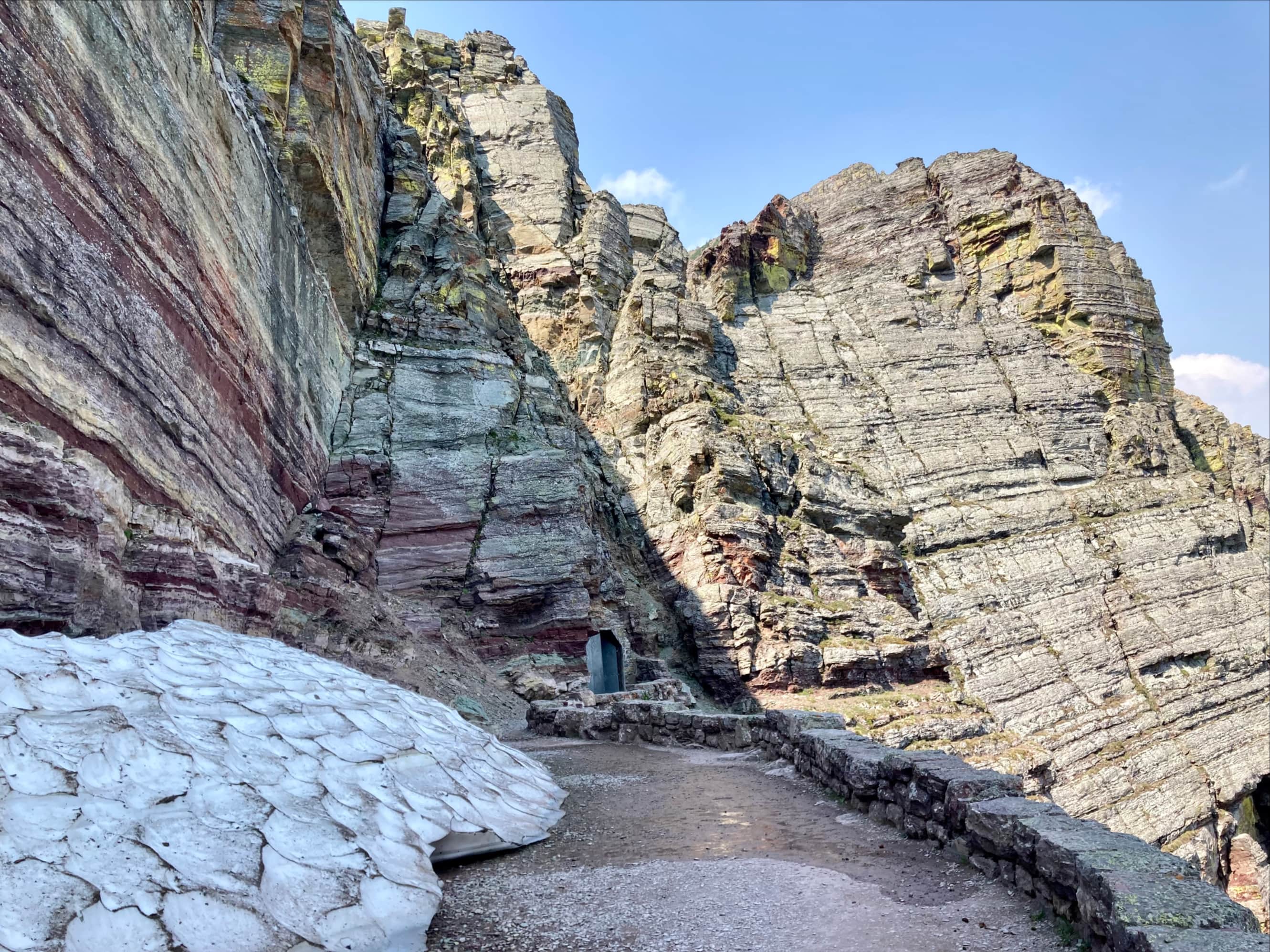 The entire hike follows a well-maintained trail, passing through a pleasant mixture of treed and open terrain. During the early part of the day there was a fair amount of forest fire smoke obscuring distant views. This cleared towards the end of the day. About 4.5 km up the trail, just past Ptarmigan Falls, there’s a fork in the trail. The left fork leads to Iceberg Lake and the right to Ptarmigan Tunnel. We went right first, eventually reaching Ptarmigan Lake sitting beneath a steep headwall. The trail then ascends the headwall via two broad switchbacks before reaching a broad landing in front of a large iron door and a tunnel piercing through the mountain. The doors are closed most of the year due to snow. According to the National Parks Service they’re usually open mid-July until late-September.