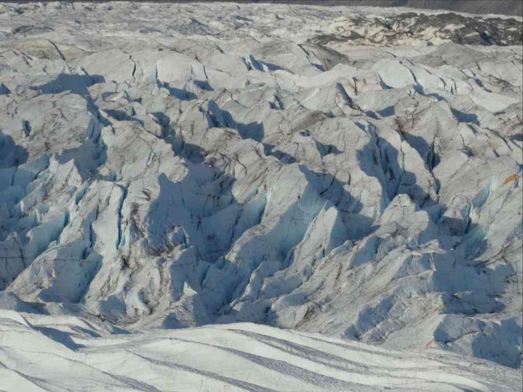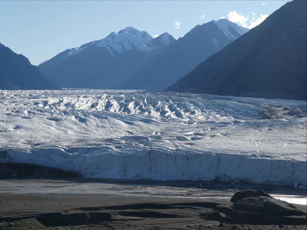 The massive Donjek Glacier is 25 km in a straight line from the Alaska Highway where it curves around Kluane Lake in the Yukon. It lies hidden behind the front ranges of the St. Elias Mountains, so no highway travellers can see it. No side-roads provide access and no official trail exists. To see it, you need to peek out the window of a passing airliner, book a ride on on a glacier sightseeing flight, or walk there along the remote Donjek (Dän Zhür) Route.