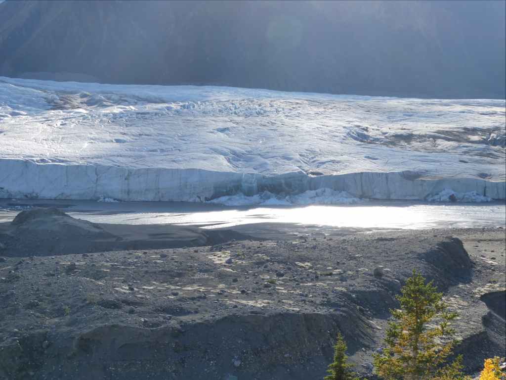 As we walked along we made a note of landmarks from the route description: a creek bed of pink coloured rocks, a “clear creek” near a balsam grove (though the water was very silty when we crossed) and a miserable 2 km section of “thicker shrubs”. After roughly 11 km the trail crossed a fan of creek beds (some with clear running water) and brought us to a large clearing with a clear view of the Donjek Glacier. We deviated west and to the edge of a steep drop overlooking the glacier and river valley. We followed this a little over 1 km to a rocky overlook with a magnificent view of the glacier and a good camping area adjacent to it.