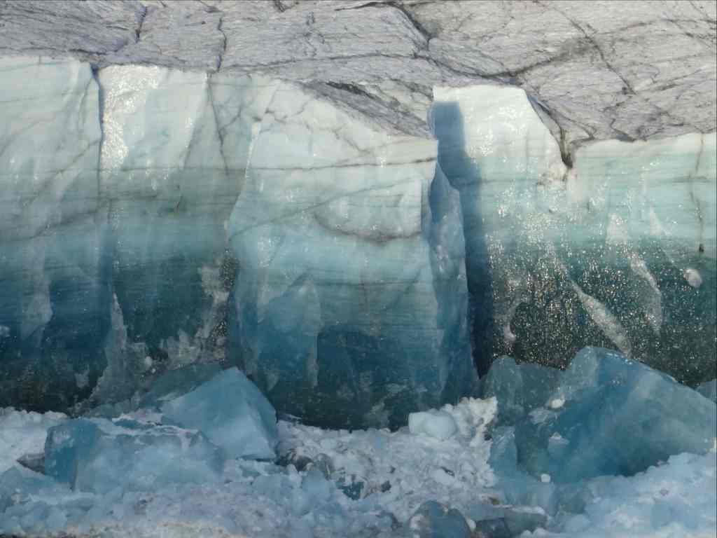 The night was peaceful, but not quiet. The glacier continued its endless booms and rumbles. The morning was clear and bright. Over breakfast and as we broke camp we watched sunrise light the peaks above the glacier then the glacier itself. We took many more pictures then finally set out on the return journey.