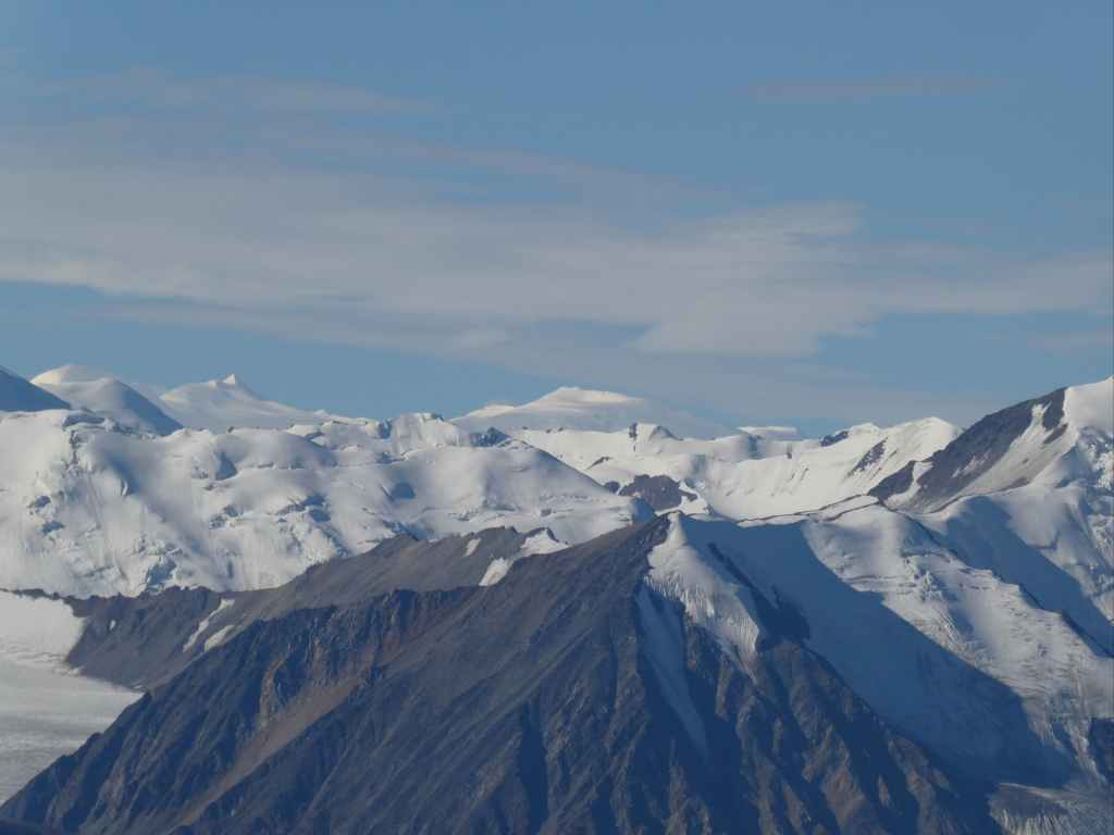 We dropped our packs at the top of the pass and ascended a rise to the south. At the top of the rise we found the best viewpoint of the entire trek. Below us we had an expansive view of the Donjek River Valley. The Donjek Glacier was to our right and to the left we had a clear view of the distant Kluane Glacier. In front, stretching to either horizon, were the peaks of the Icefield Ranges of the St. Elias Mountains.