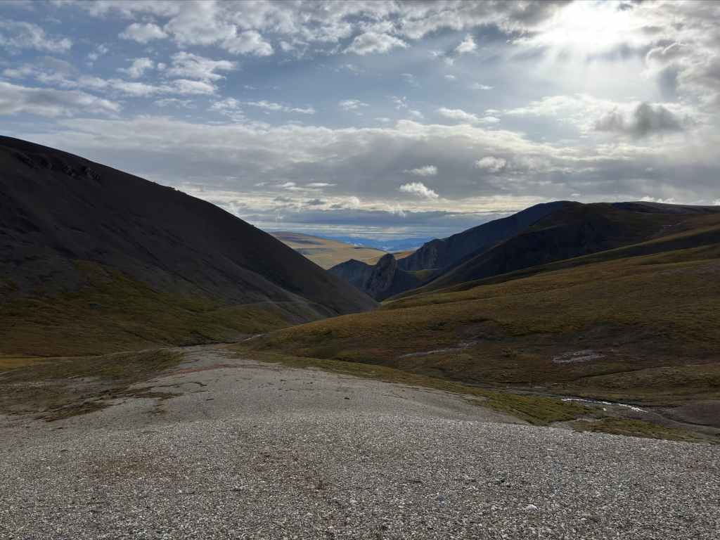 The next morning we delayed breaking camp until the rain settled down. According to forecasts from Garmin, this was to be our last night with any significant precipitation. That turned out to be accurate. Once we were packed and ready to go we got onto the old mining road. We followed this up a wide valley to Hoge Pass. This was some of the most enjoyable hiking of the whole trip. The grade was very manageable, there was no vegetation to fight through, and the footing was supportive. As we got nearer to the pass the road petered out. As per the route description we angled southwest and ascended a light grey coloured hill then contoured around a depression and ascended again to reach the top of the pass. I was surprised to find more hummocky terrain as we moved along. We would discover that this terrain was present in all the mountain passes, acting as a water sponge and seeming to be the origin of many creeks.