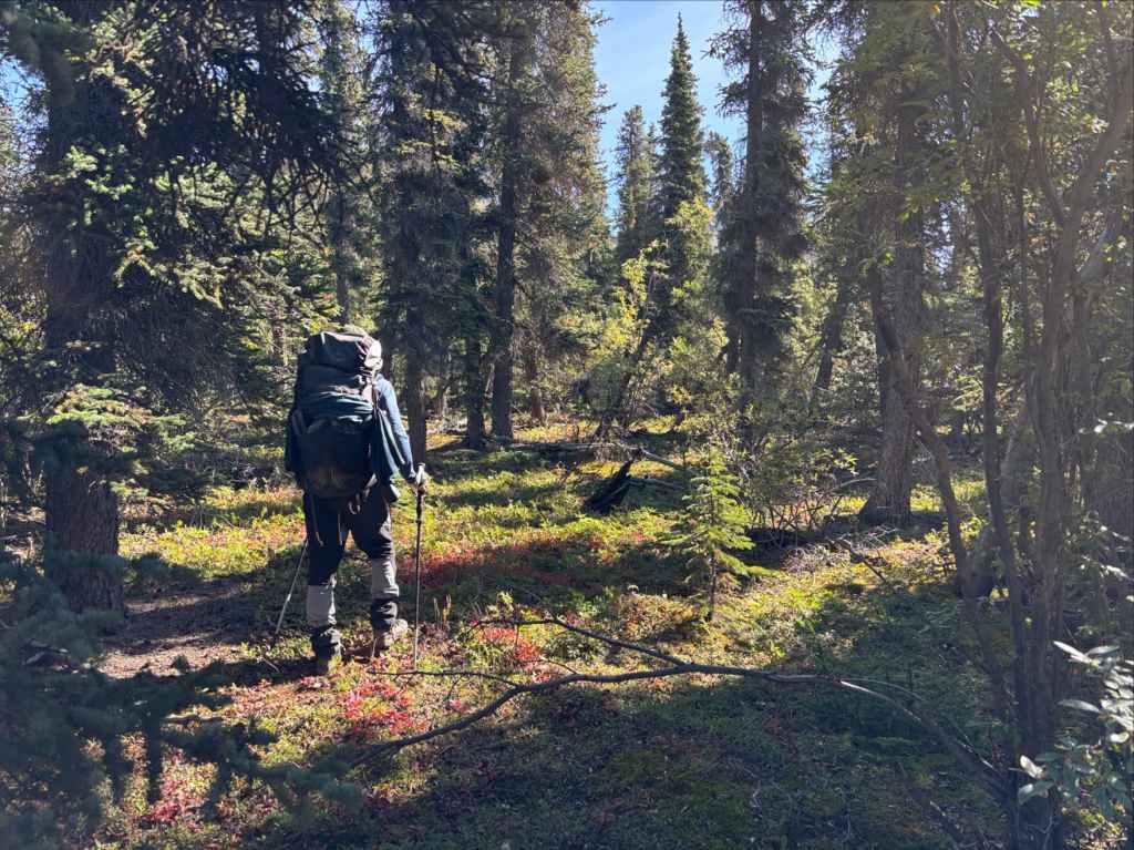 After we’d warmed up sufficiently we set off again, looking for the spot where we’d turn away from the Duke River and head up towards Cache Lake. We went a little over 2 km upstream to a spot where the vegetation began to thin and pull away from the river bank. Soon we identified what Yukon Hiking describes as a “small aluvial fan”. We entered the forest here and started to bushwhack uphill, trying to find an old road. This was a bit of miserable bushwacking, once again on poor footing. We knew the general direction we had to head in, and that combined with GPS waypoints got us onto an old road. When we arrived at it I was almost tempted to follow it downhill to see if there was a smarter way we could have found it. I didn’t, though, since we were so happy to have a clear path to follow and immediately continued climbing.