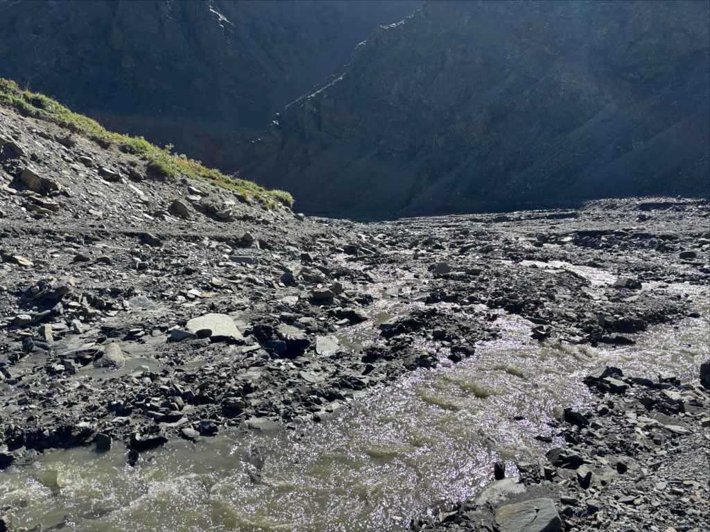 The descent from Atlas Pass is identified as a point of caution in Parks Canada’s route description. They state, “Simply going straight down the most direct route off the pass is neither inviting nor recommended.” Yukon Hiking says, “the descent is not challenging from the pass, but requires following a specific route down”. The specific route involves ascending the ridge north of the pass, skirting right (east) below a cliff and getting onto a gently curved ridge about 200 m from the pass descending steadily downward. Once at the top of that ridge a small patch of grass is visible on a little platform far downhill and to the left of it. The little patch of grass is referred to as “Hole #9”. This was our next objective. We descended to it easily enough. Once at the grass, we could see a clear path of descent to the right as we looked at it, heading directly to Atlas Creek. This short stretch was a little treacherous as the footing was sometimes poor and the pitch was very steep. After some thankfully minor struggles we found ourselves down at the level of the creek and hiking downstream.